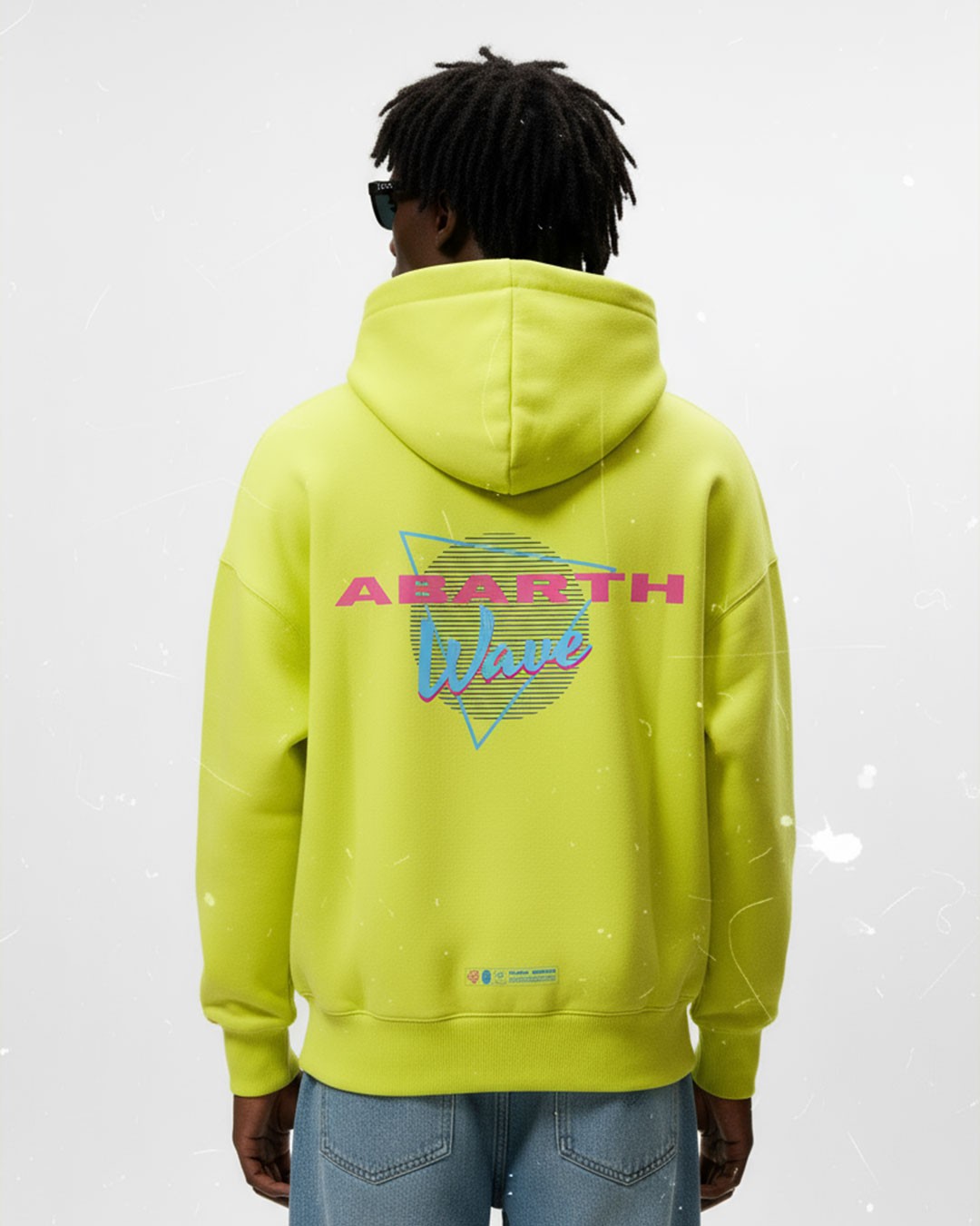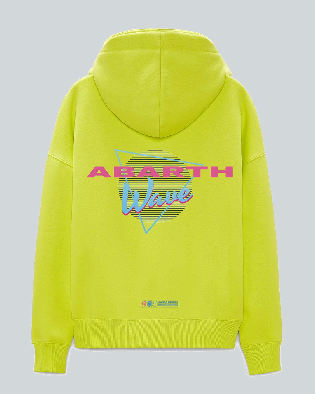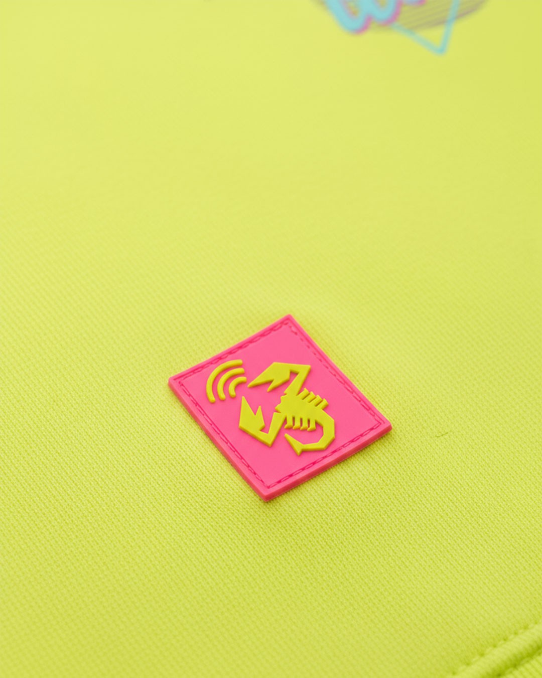 Tessuto tinto in Pantone 381C "giallo acido"; grafica (lato cuore + retro): DTF + Flok Print Yellow fascia antisudore 100% cotone all'interno del collo; Etichetta del marchio; Patch NFC.