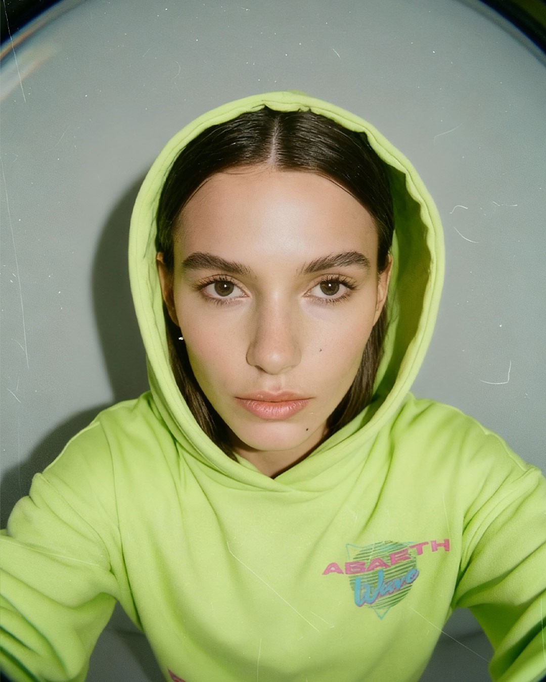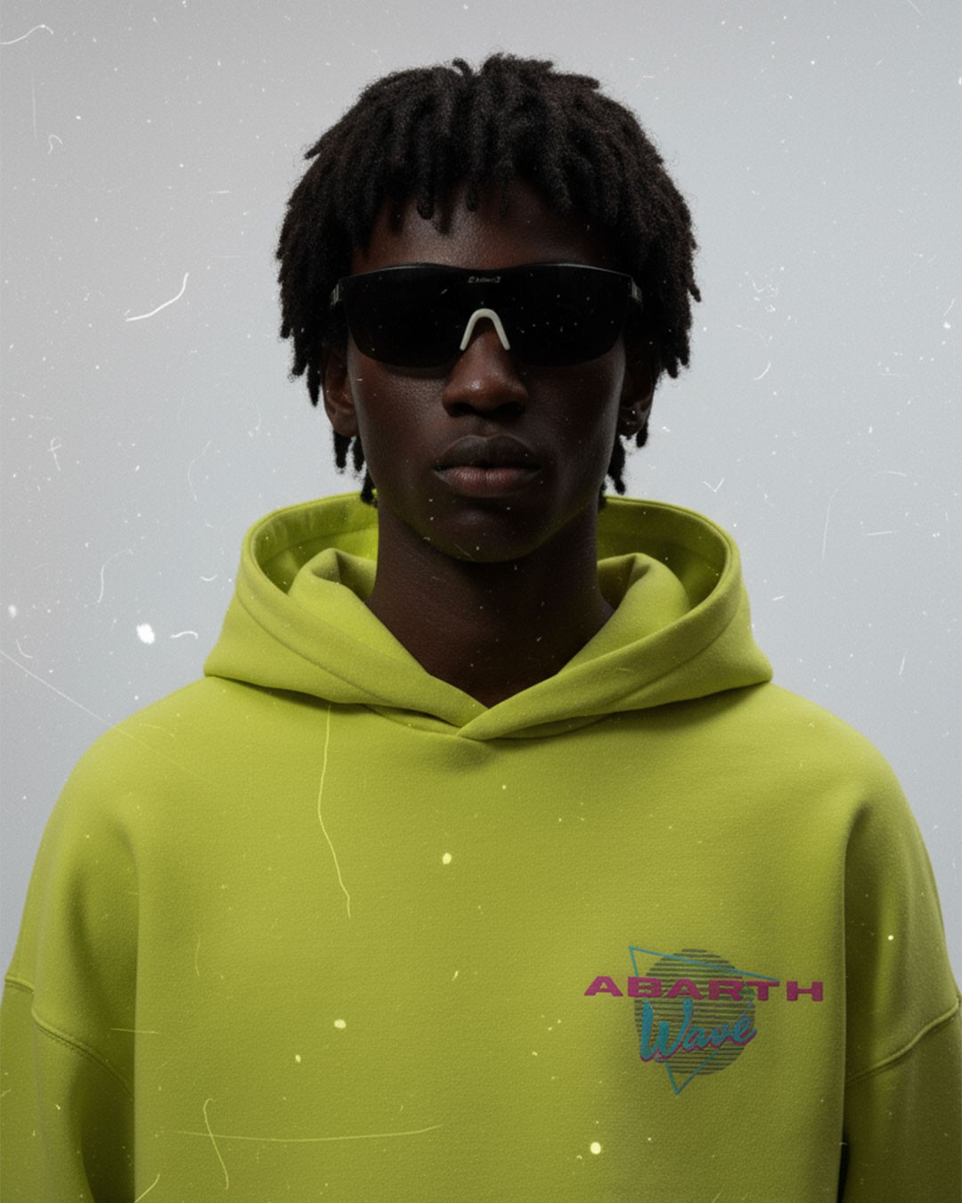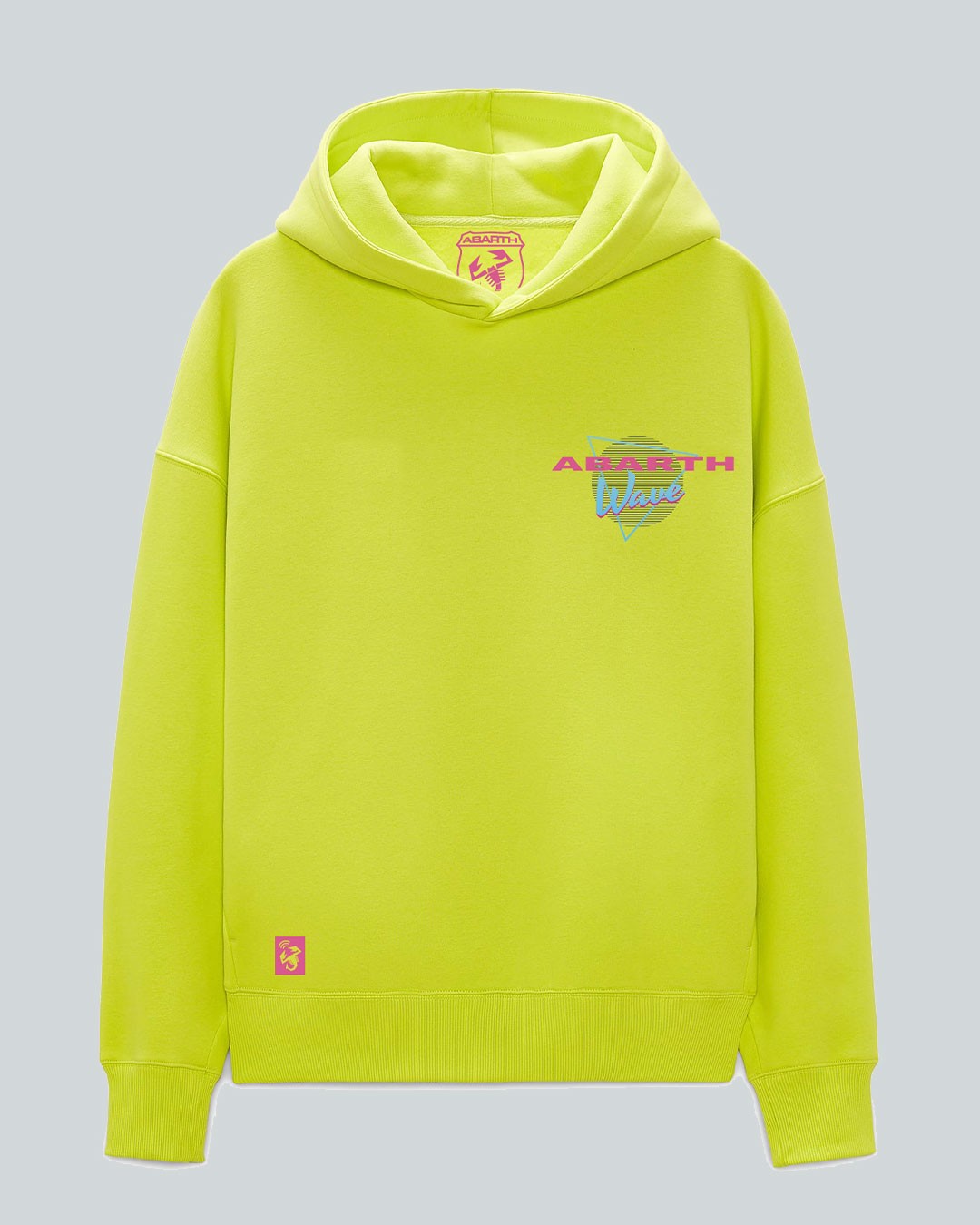 Tessuto tinto in Pantone 381C "giallo acido"; grafica (lato cuore + retro): DTF + Flok Print Yellow fascia antisudore 100% cotone all'interno del collo; Etichetta del marchio; Patch NFC.